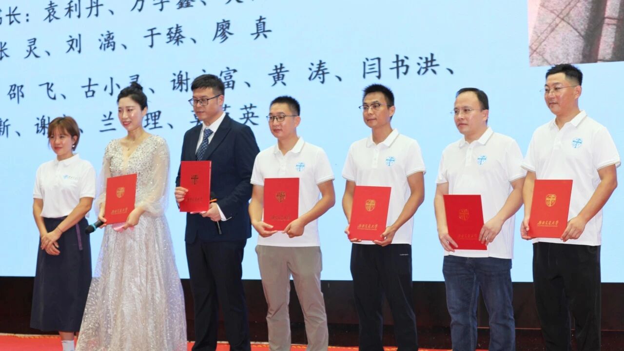 杨爱华向柳州校友会授会旗。嘉宾为柳州校友会第一届理事会成员颁发荣誉证书。