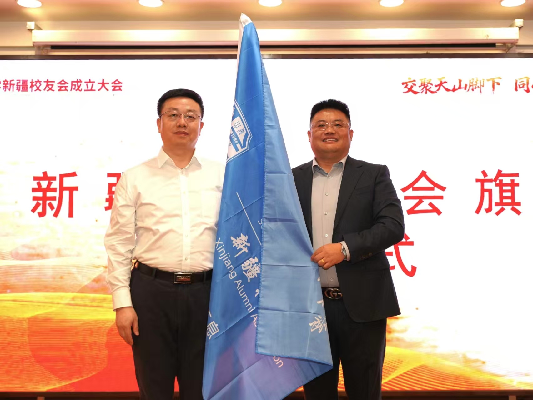 夏玉峰向新疆校友会授会旗。嘉宾为新疆校友会第一届理事会成员颁发荣誉证书。