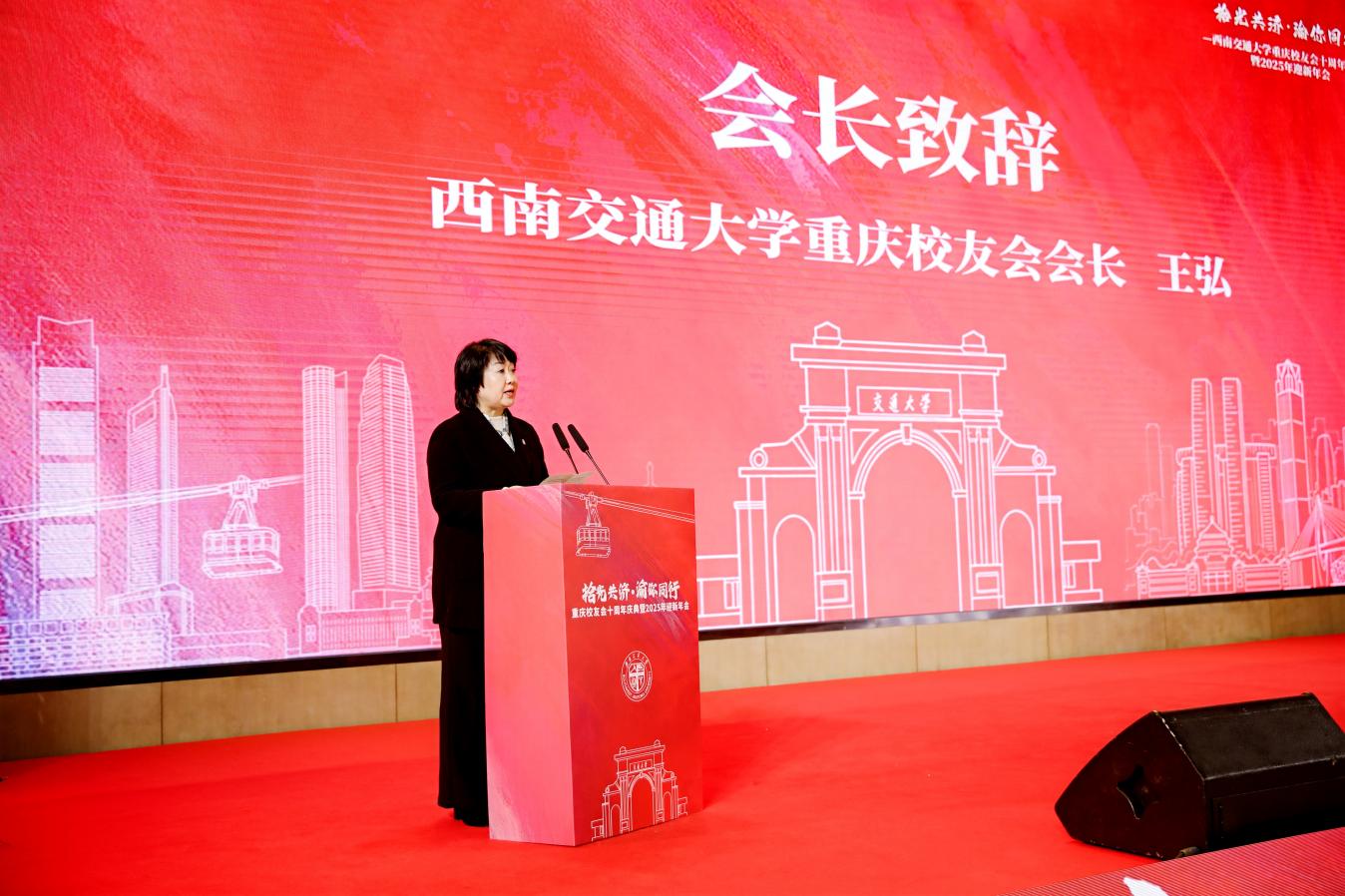 重庆校友会会长王弘代表校友会致辞。她回顾了校友会十年发展历程,从2015年28位热心校友重启工作,到如今汇聚5000余名在渝校友、搭建20余个兴趣专业分群,校友会始终秉持“校友的小事当作校友会的大事”理念,用心服务来渝毕业生及外地来渝校友,积极推动校地企合作,让交大力量深度融入重庆发展。她表示,未来将继续带领校友会坚守交大精神,凝聚校友力量,当好母校与在渝校友的桥梁纽带。