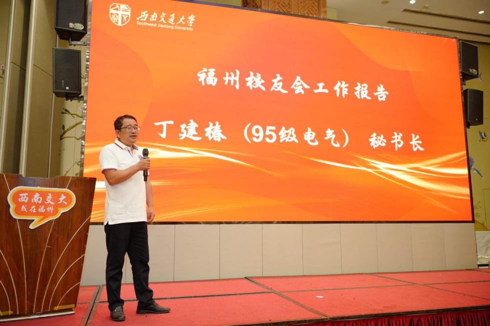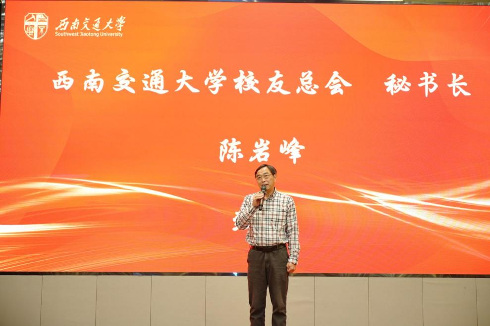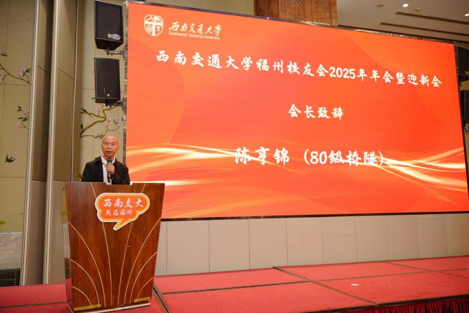 陈岩峰向福州校友会新一届理事会的成立及年会的成功举办表示祝贺。他充分肯定福州校友会在联络校友、服务地方、支持母校等方面取得的扎实成效,并详细介绍了学校130周年校庆全球校旗传递活动的宏伟规划。最后,他号召在座所有交大人携手并肩,在2026年百卅校庆之际重返峨眉、再聚九里,共襄盛举、共享荣光。