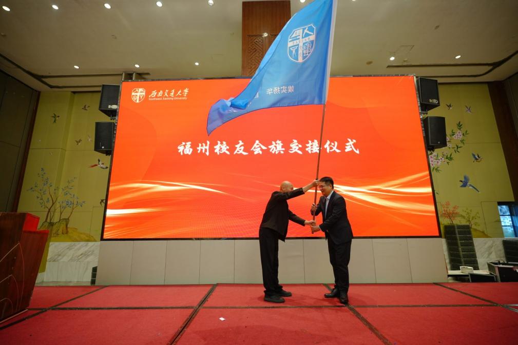 在接下来的校友会会旗交接仪式上,第一届会长陈亨锦郑重将西南交通大学福州校友会会旗传递至第二届会长夏炜洋手中。旗帜所承,是责任与使命;旗之所向,是发展与未来。全场响起热烈掌声,见证这一薪火相传的历史时刻。