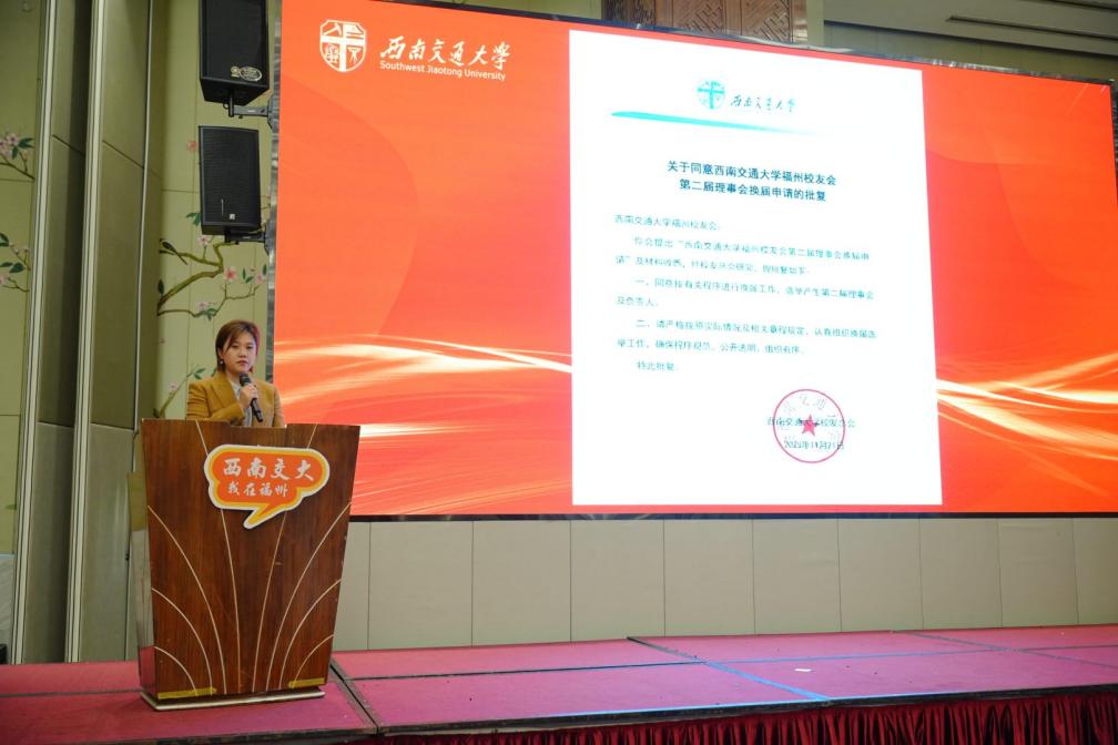 刘堃宣读《关于同意西南交通大学福州校友会第二届理事会换届的批复》,正式确认新一届理事会组织架构合法有效。