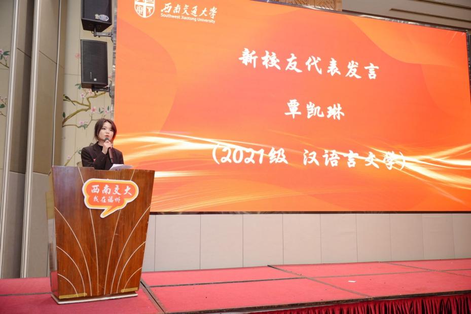 2021级汉语言文学专业毕业生覃凯琳作为新校友代表发言。她动情分享了在母校的求学时光,由衷感慨校友会“此心安处是吾乡”的融融暖意,表达初入校友大家庭的感动与对个人成长、校友会蓬勃发展及母校再创辉煌的美好憧憬。