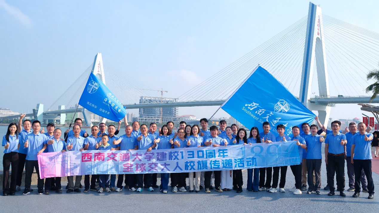 会议同期,西南交通大学建校130周年全球交大人校旗传递活动(海口站)在世纪大桥前举行。